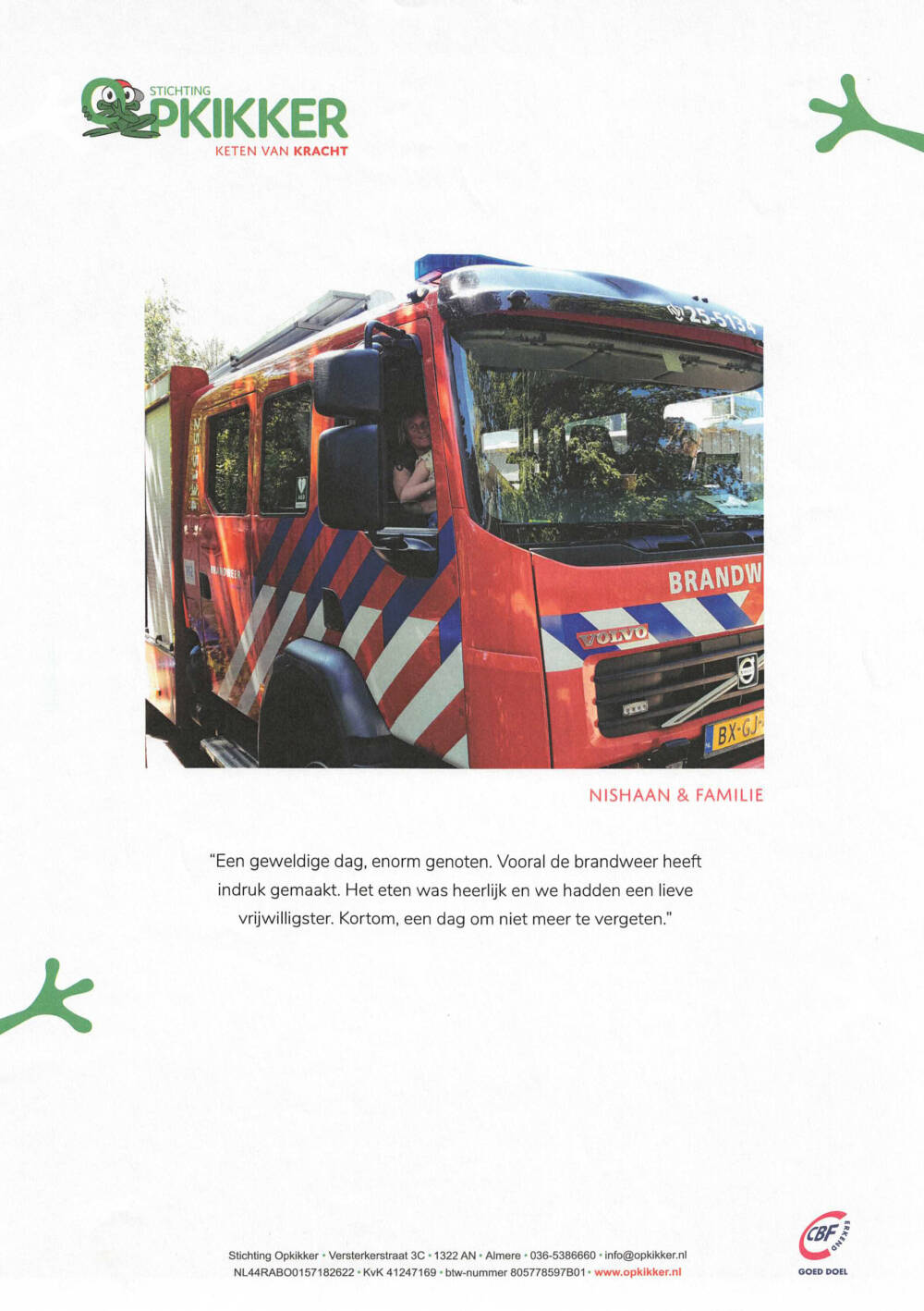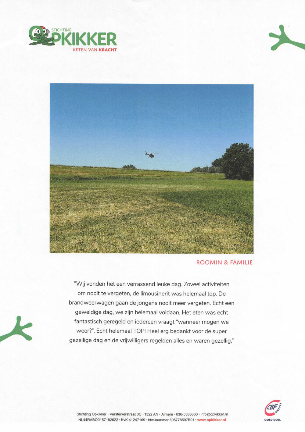 Bij Otjensgroep geloven we in het belang van maatschappelijke betrokkenheid en het creëren van geluksmomenten voor anderen. Daarom zijn we ontzettend trots om Stichting Opkikker te steunen en te sponsoren, een organisatie die gezinnen in moeilijke tijden een welverdiende glimlach bezorgt. Graag delen we twee hartverwarmende brieven van de families van Roomin en Nishaan, die laten zien hoe Stichting Opkikker hen een geweldige dag heeft bezorgd!